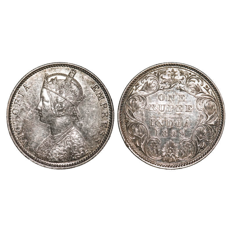 | Victoria Empress, Silver, Rupee, 1892, Bombay Mint, C2/I(ii), 'B' incused, Die crack on Obv. F. Prid Unlisted. GK 573. Brilliant Uncirculated, Toned, Proof like finish. Rare. |