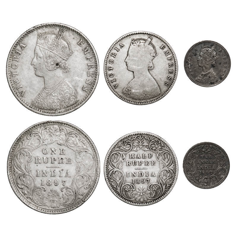 | Victoria Empress, Silver, 1897 (3 coins), Calcutta Mint, 1) Rupee, C3/I(i), 'C' incused, 2) Half Rupee, A/I, 'C' incused, 3) 2 Annas, B/II, 'C' incused. F. Prid 136, 280, 512. GK 582, 657, 807. Fine to Very Fine+. Very Scarce. |