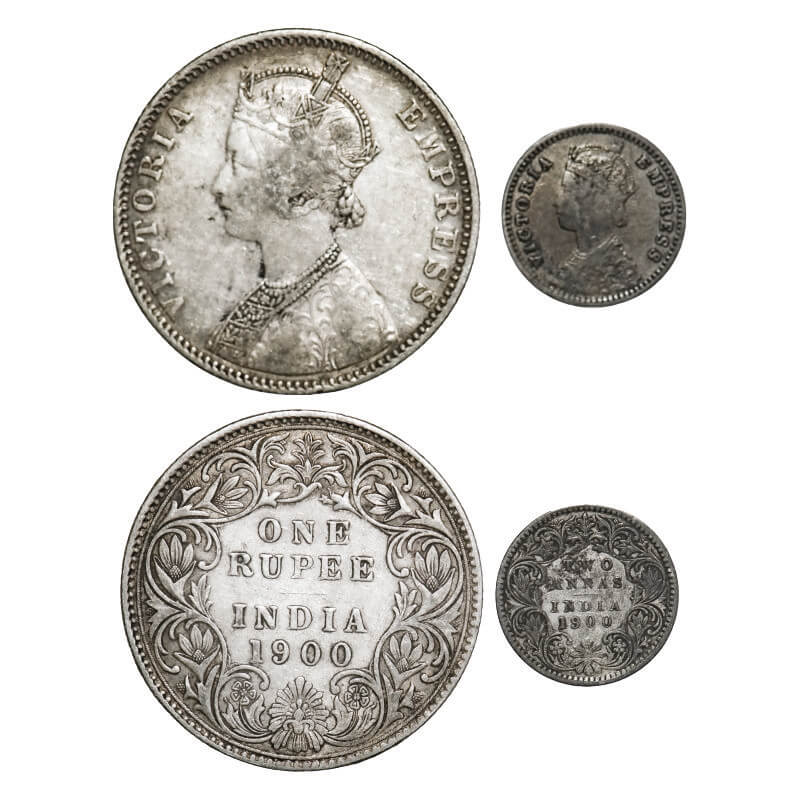 | Victoria Empress, Silver, 1900 (2 coins), Bombay Mint, 1) Rupee, A3(i)/I(ii), 'B' incused, 2) 2 Annas, B/I, 'B' raised, Big B. F. Prid 186, 553. GK 589, 812. Very Fine. Scarce. |