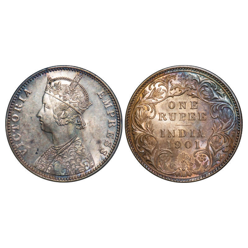 Victoria Empress, Silver, Rupee, 1901, Bombay Mint, A3(i)/I(ii), 'B' incused. F. Prid Unlisted. GK 591. Brilliant Uncirculated, Rainbow Toned Rev. Rare.