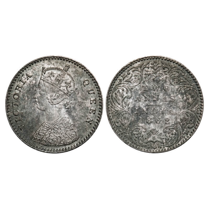 Victoria Queen, Silver, 2 Annas, 1862, Calcutta Mint, A/I, Bottom flower centre top petal broader then left and right connecting petals. F. Prid 485. GK 381. Brilliant Uncirculated, Toned. Rare.