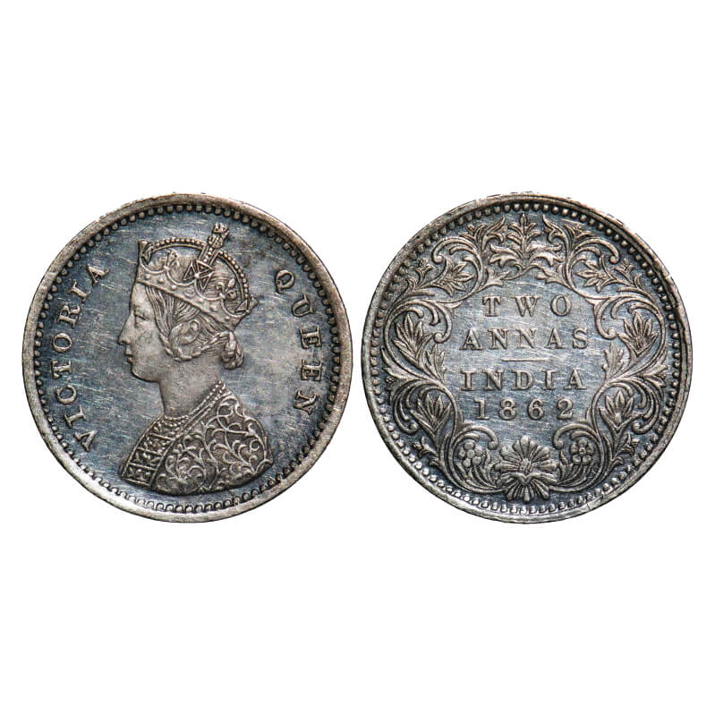 Victoria Queen, Silver, 2 Annas, 1862, Bombay Mint, A/I,Bottom flower centre top petal broader then left and right connecting petals. F. Prid 486. GK 383. Almost Uncirculated. Very Scarce.