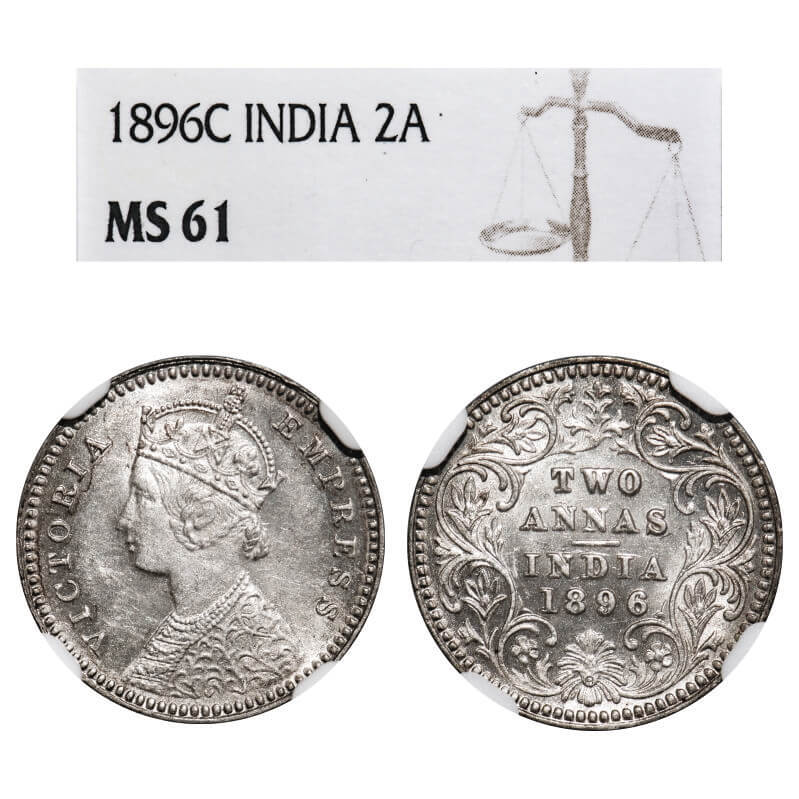 Victoria Empress, Silver, 2 Annas, 1896, Calcutta Mint, B/II, 'C' incused. F. Prid 511. GK 805. NGC Slabbed MS 61. Rare.