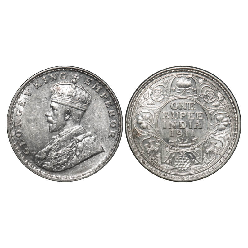 | George V, Silver, Rupee, 1911, Bombay Mint, Dot, Pig-Type, Die crack on Rev, Raised initials 'B M' Bertram MacKennal on the truncation of the Kings shoulder. F. Prid 217. GK 1022. Uncirculated. Rare. |