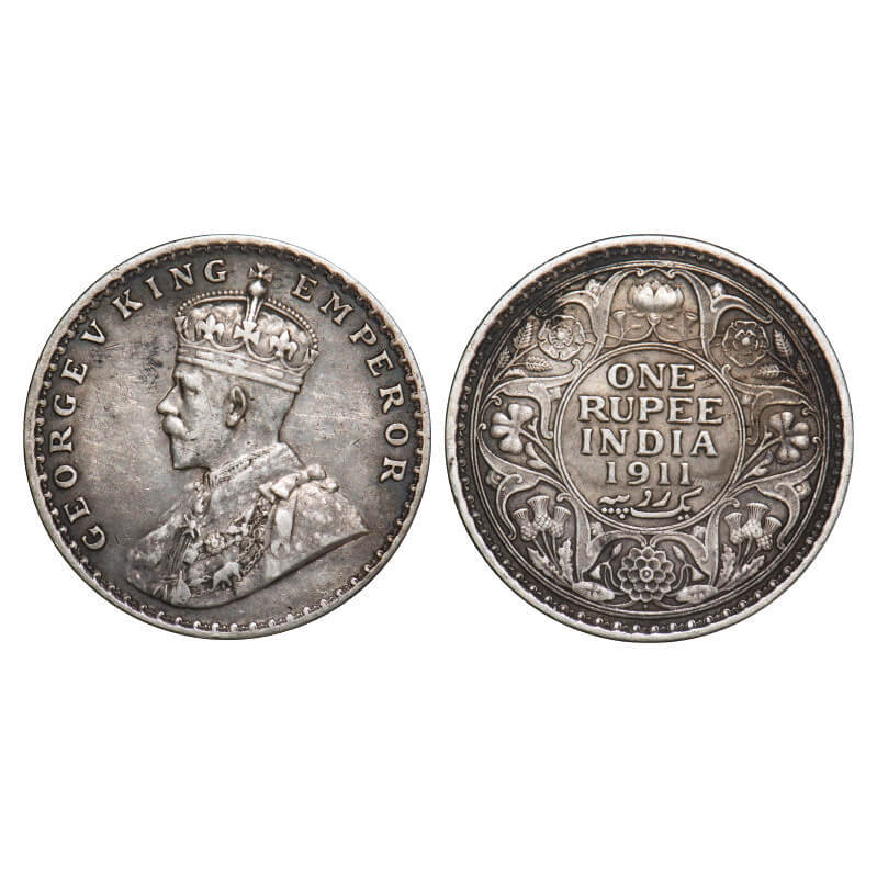 George V, Silver, Rupee, 1911, Bombay Mint, Dot, Pig-Type, Raised initials 'B M' Bertram MacKennal ...