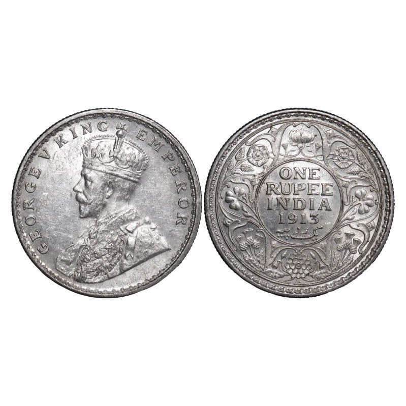 George V, Silver, Rupee, 1913, Calcutta Mint, No dot. F. Prid 209. GK 1027. About Uncirculated. Very Scarce.