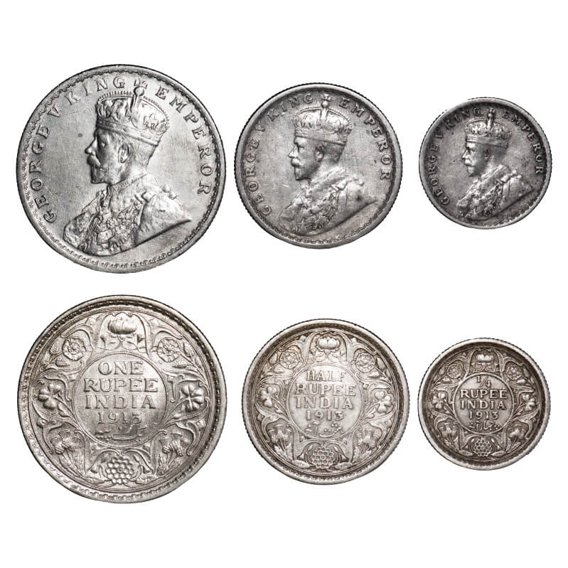 | George V, Silver, Rupee, Half Rupee, 1/4 Rupee, 1913 (3 coins), 1) Calcutta Mint, No dot, 2) Bombay Mint, Dot, 3) Calcutta Mint, No dot. F. Prid 209, 337, 442. GK 1027, 1049, 1083. Very Fine+ to Extremely Fine+. Scarce as a lot. |