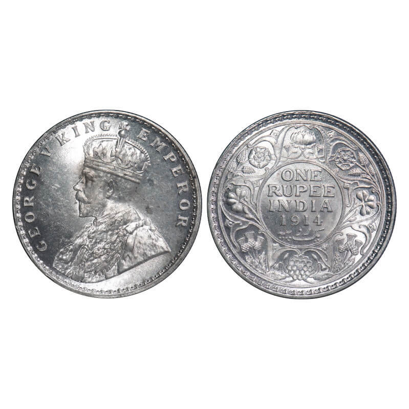 George V, Silver, Rupee, 1914, Calcutta Mint, No dot. F. Prid 210. GK 1029. Mint State. Rare.