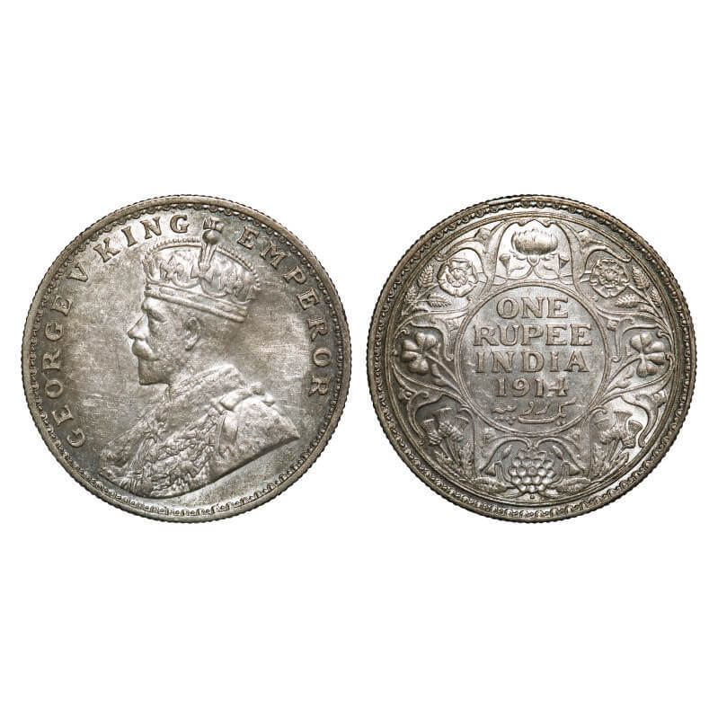 George V, Silver, Rupee, 1914, Calcutta Mint, No dot. F. Prid 210. GK 1029. Mint State. Rare....