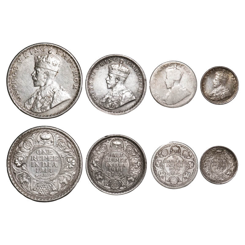 | George V, Silver, Rupee, Half Rupee, 1/4 Rupee & 2 Annas, 1914 (4 coins), Bombay Mint, Dot. F. Prid 220, 338, 456, 573. GK 1030, 1051, 1086, 1113. Fine to Extremely Fine+. Scarce as a lot. |