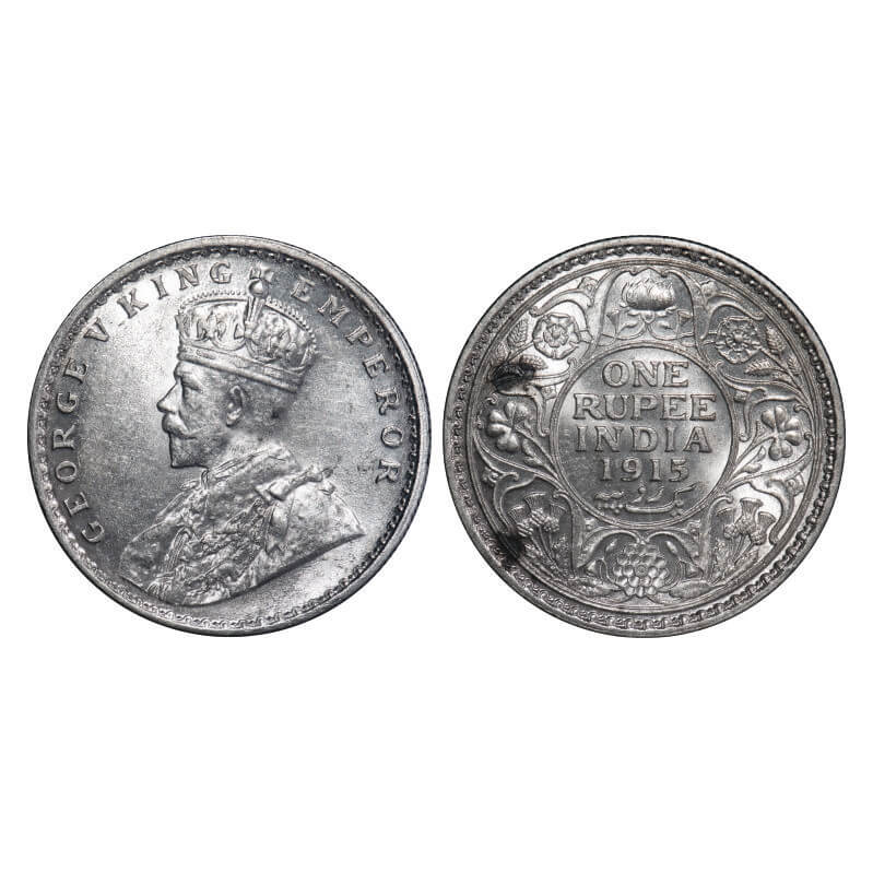 George V, Silver, Rupee, 1915, Calcutta Mint, No dot. F. Prid 211. GK 1031. Brilliant Uncirculated. Rare.