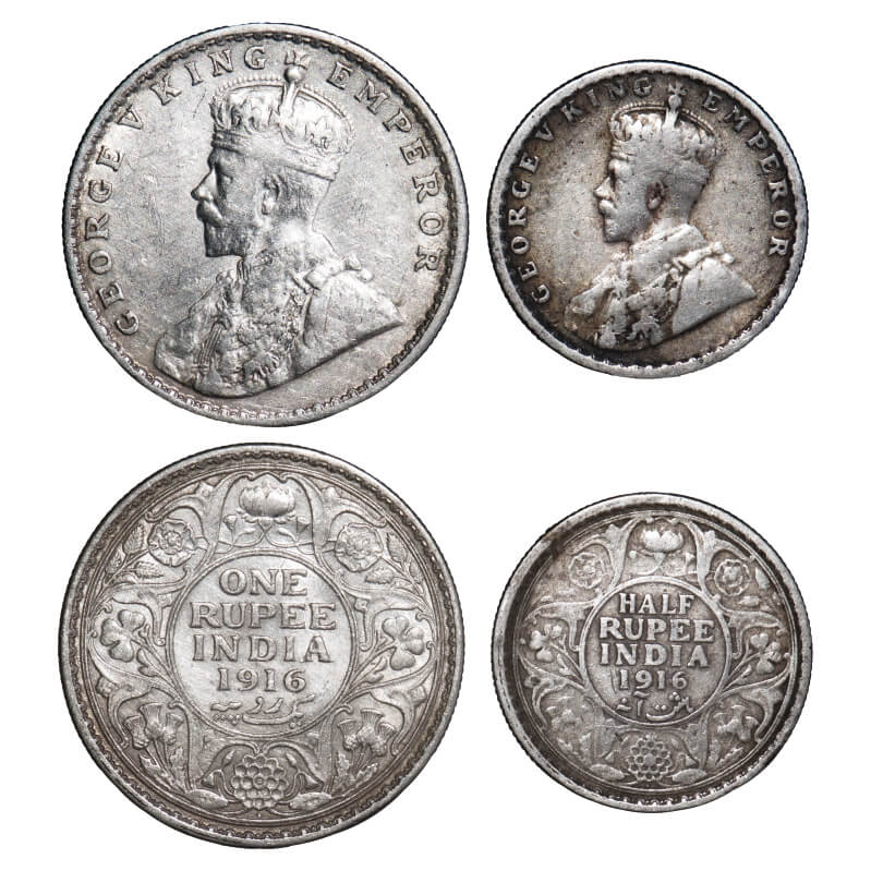 | George V, Silver, Rupee, Half Rupee, 1916 (2 coins), Bombay Mint, Dot. F. Prid 222, 340. GK 1034, 1054. About Very Fine+ to Almost Very Fine. Scarce. |
