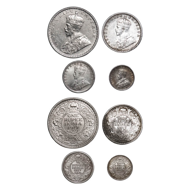 | George V, Silver, 1917 (4 coins), 1) Rupee, Calcutta Mint, No dot, 2) Half Rupee, Bombay Mint, dot, 3) 1/4 Rupee, Calcutta Mint, No dot, 4) 2 Annas, Calcutta Mint, No dot. F. Prid 213, 341, 446, 570. GK 1035, 1055, 1090, 1117. Very Fine+ to About Uncirculated. Scarce as a lot. |