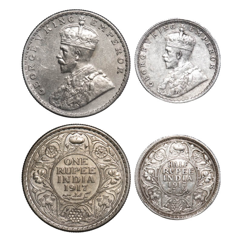 George V, Silver, 1917 (4 coins), 1) Rupee, Calcutta Mint, No dot, 2) Half Rupee, Bombay Mint, dot,...