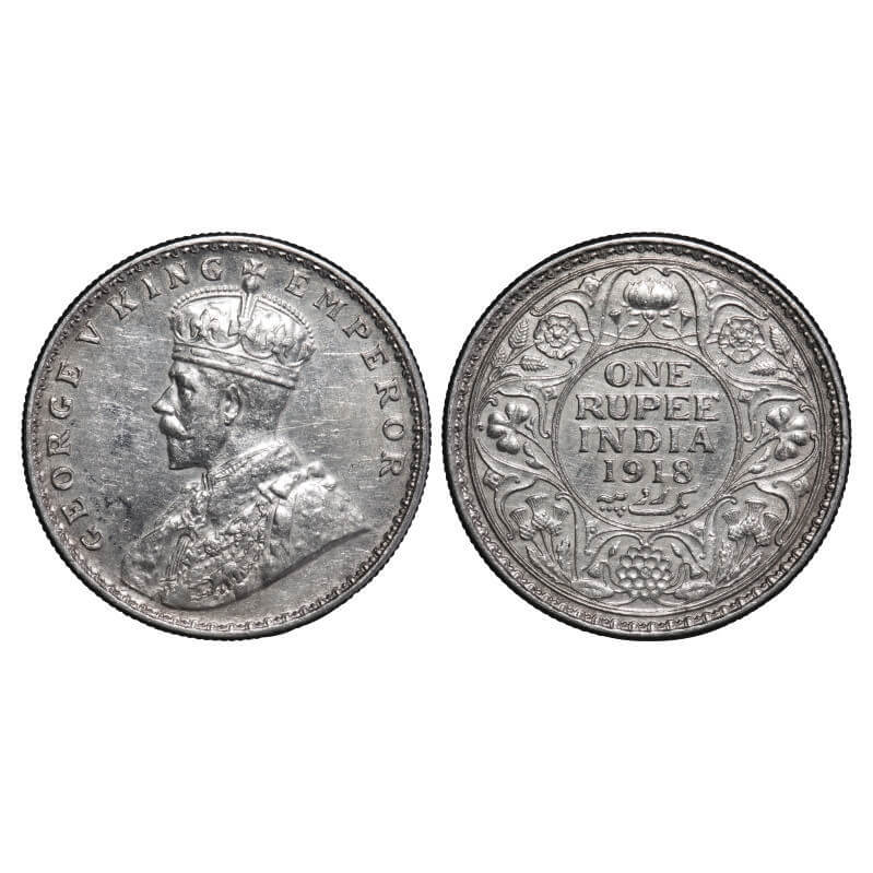 George V, Silver, Rupee, 1918, Calcutta Mint, No dot, Bottom curve of numeral 8 in year date 1918 i...