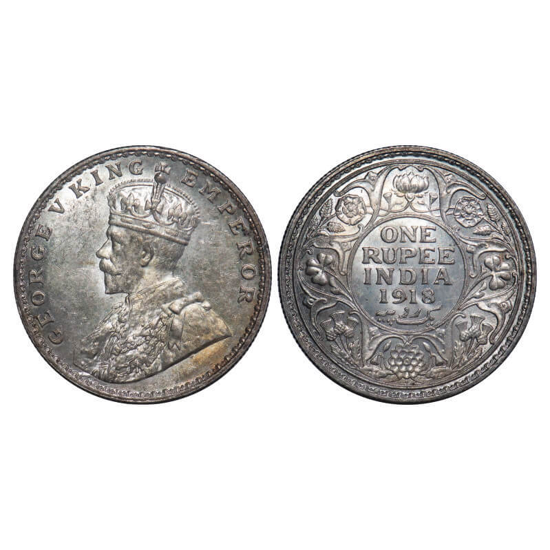 George V, Silver, Rupee, 1918, Calcutta Mint, No dot, Bottom curve of numeral 8 in year date 1918 i...