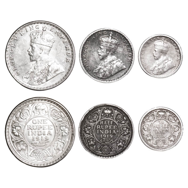 | George V, Silver, 1919 (3 coins), 1) Rupee, Calcutta Mint, No dot, 2) Half Rupee, Bombay Mint, Dot, 3) 1/4 Rupee, Calcutta Mint, No dot. F. Prid 215, 343, 448. GK 1039, 1057, 1092. Very Fine to About Unciculated. Scarce. |