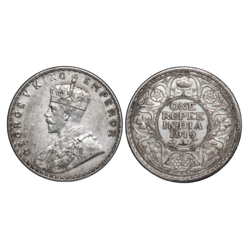 | George V, Silver, Rupee, 1919, Bombay Mint, Dot, Crudish, Thin and Bloated lettering with Elephant on the robed bust looking very thin with sunked trunck, Fer letters in King are die filled. F. Prid 225. GK 1040. Extremely Fine+. Rare. |