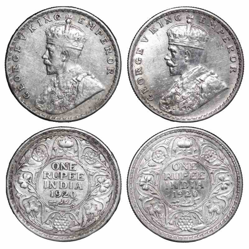 | George V, Silver, Rupee, 1920 (2 coins), 1) Calcutta Mint, No dot, 2) Bombay Mint, Dot. F. Prid 216, 226. GK 1041, 1042. Very Fine+ to Extremely Fine+, Scarce. |