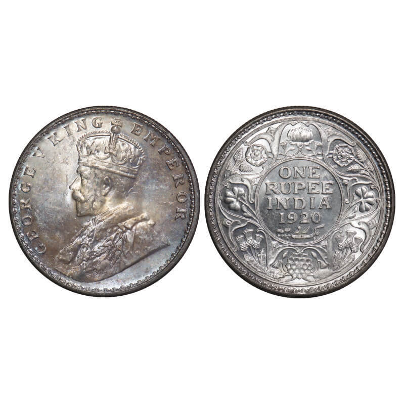George V, Silver, Rupee, 1920, Calcutta Mint, No dot,Complete skull ghost on Rev. F. Prid 216. GK 1041. Mint State with original mint luster. Rare.