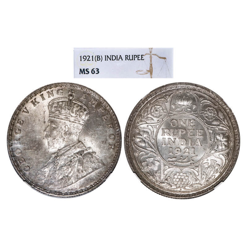 George V, Silver, Rupee, 1921, Bombay Mint, Dot. F. Prid 227. GK 1043. NGC Slabbed MS 63. Very Rare.