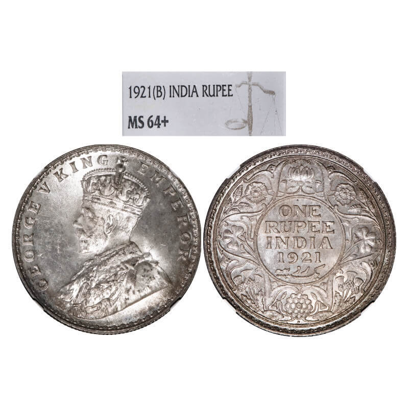 George V, Silver, Rupee, 1921, Bombay Mint, Dot. F. Prid 227. GK 1043. NGC Slabbed MS 64+. Extremely Rare.