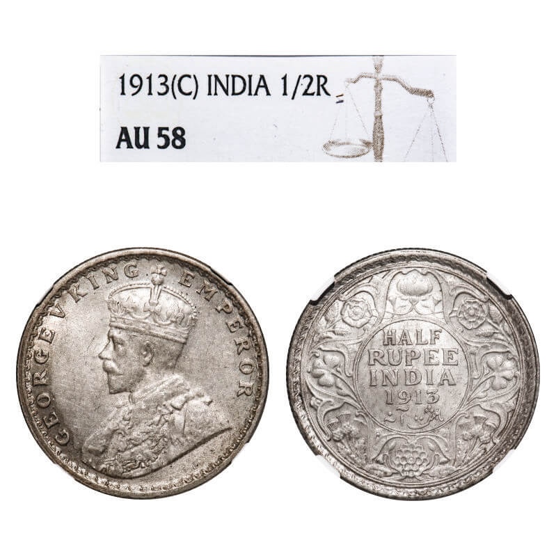 George V, Silver, Half Rupee, 1913, Calcutta Mint, No dot. F. Prid 320. GK 1048. NGC Slabbed AU 58. Very Rare.