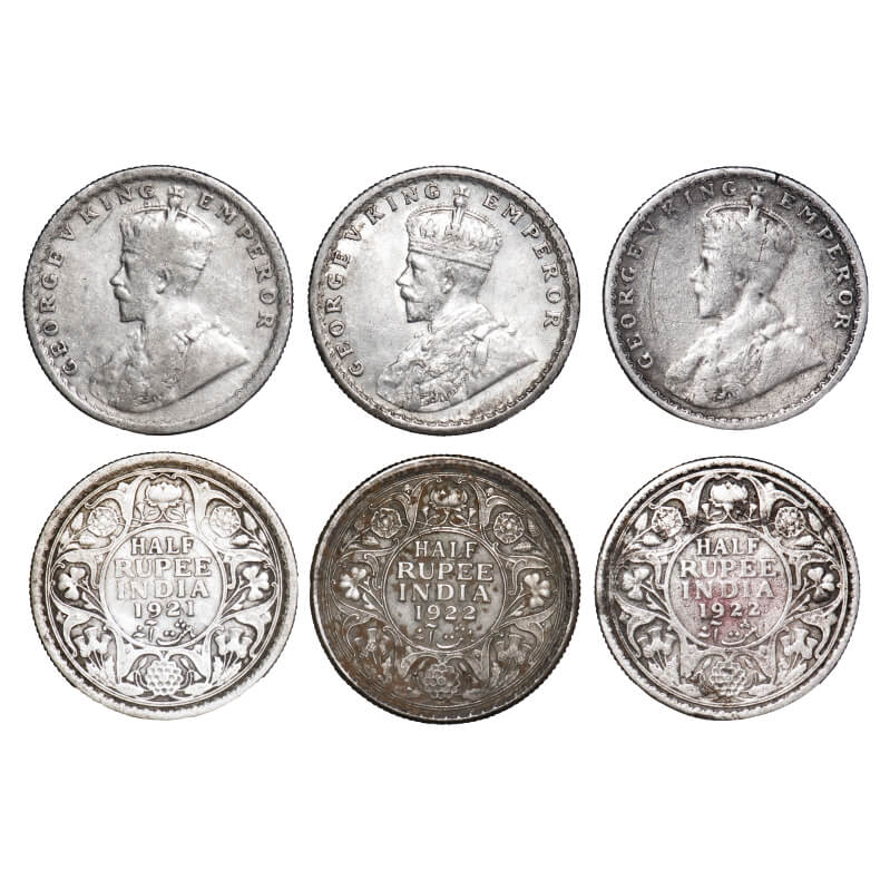 | George V, Silver, Half Rupee (3 coins), 1) 1921, Calcutta Mint, No dot, 2) 1922, Calcutta Mint, No dot, 3) 1922, Bombay Mint, Dot, F. Prid 324, 325, 344. GK 1058, 1059, 1060. Fine to Extremely Fine. Scarce. |