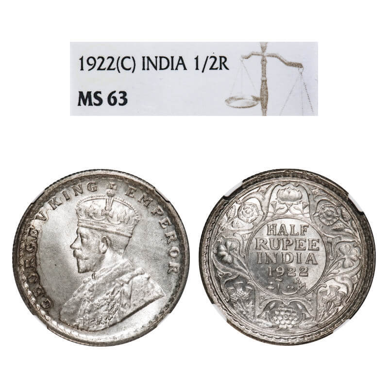 George V, Silver, Half Rupee, 1922, Calcutta Mint, No dot. F. Prid 325. GK 1059. NGC Slabbed MS 63. Very Rare.