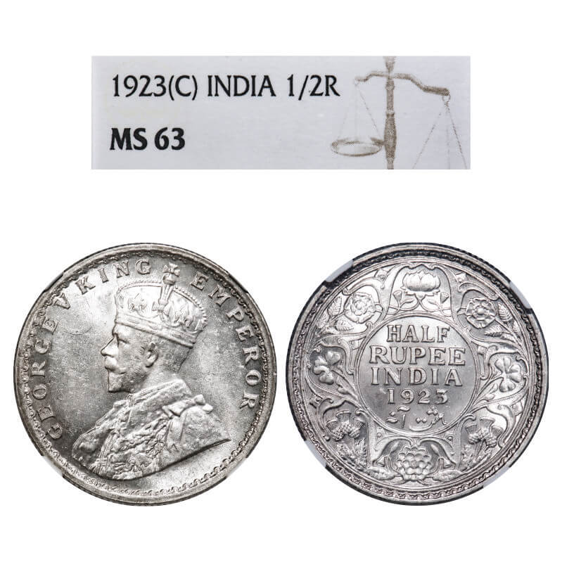 George V, Silver, Half Rupee, 1923, Calcutta Mint, No dot. F. Pri 326. GK 1061. NGC Slabbed MS 63. Very Rare.