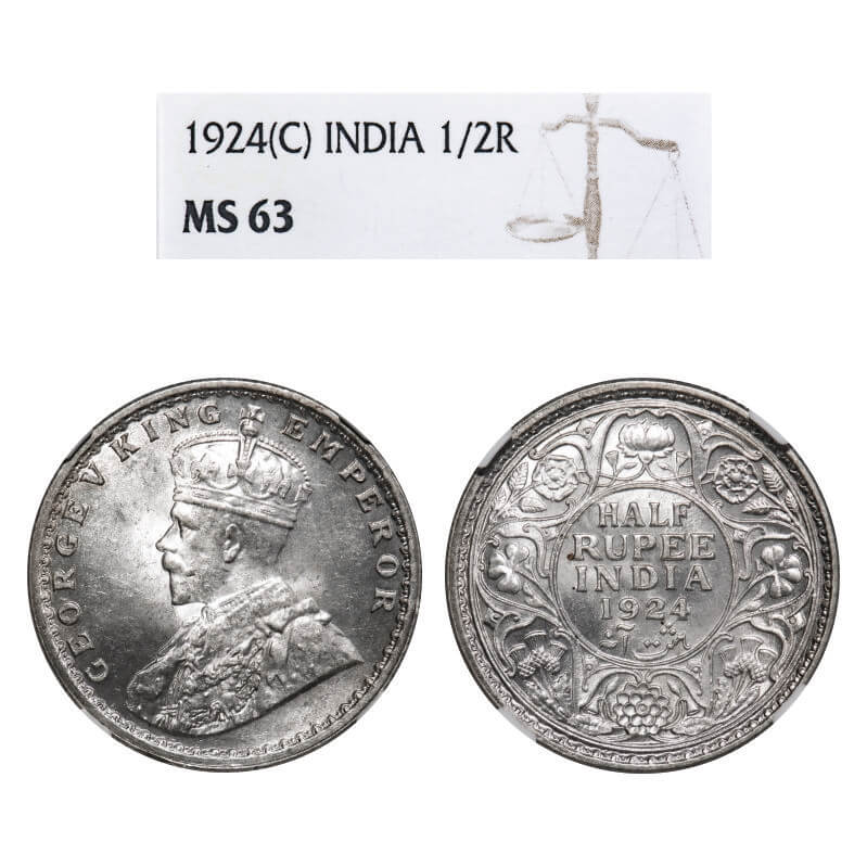 George V, Silver, Half Rupee, 1924, Calcutta Mint, No dot. F. Prid 327. GK 1063. NGC Slabbed MS 63. Very Rare.