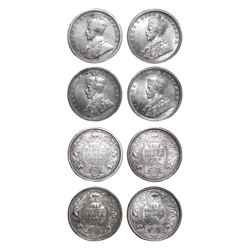 | George V, Silver, Half Rupee (4 coins), 1 & 2) 1924, Calcutta Mint, No dot, 3) 1925, Calcutta Mint, No dot, 4) 1925, Bombay Mint, Dot. F. Prid 327(2), 328, 347. GK 1063(2), 1065, 1066. Fine to Almost Uncirculated. Very Scare as a lot. |
