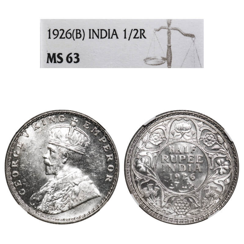 George V, Silver, Half Rupee, 1926, Bombay Mint, Dot. F. Prid 348. GK 1068. NGC Slabbed MS 63. Extremely Rare.
