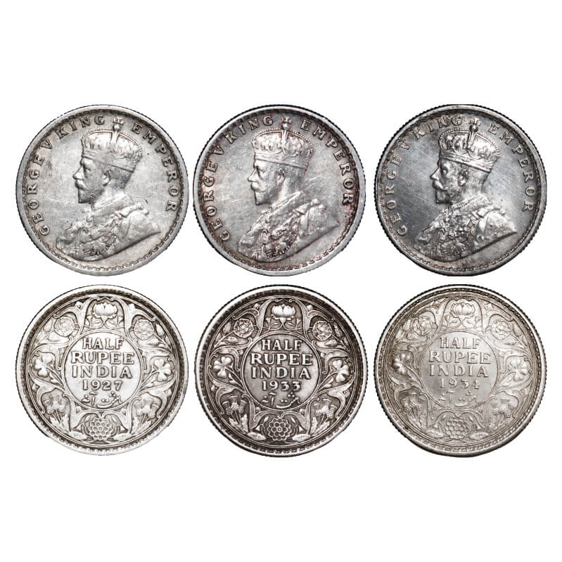 | George V, SIlver, Half Rupee (3 coins), 1927, 1933, 1934, Calcutta Mint, No dot. F. Prid 330, 333, 334. GK 1069, 1073, 1074. Very Fine to Extremely Fine+. Scarce. |
