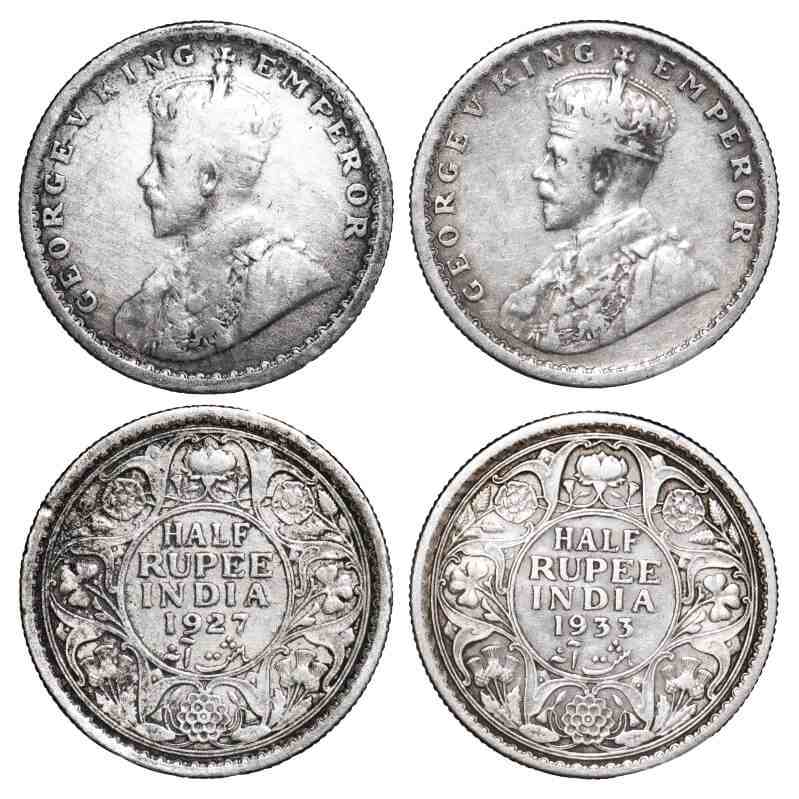 George V, SIlver, Half Rupee (2 coins), 1927, 1933, Calcutta Mint, No dot. F. Prid 330, 333. GK 1069, 1073. Fine+ to Very Fine. Scarce.
