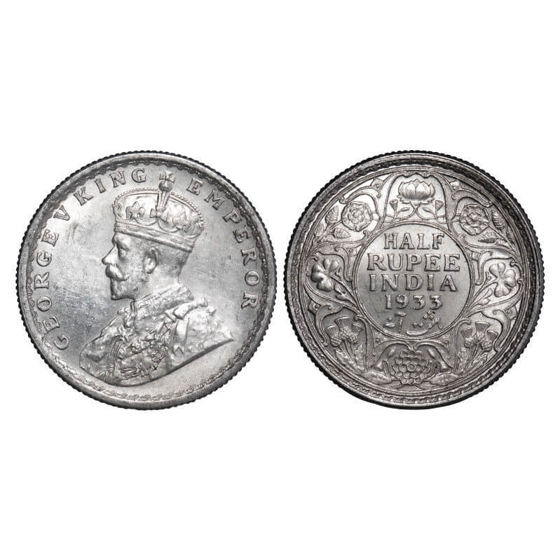 George V, Silver, Half Rupee, 1933, Calcutta Mint, No dot. F. Prid 332. GK 1072. Almost Uncirculated. Scarce.