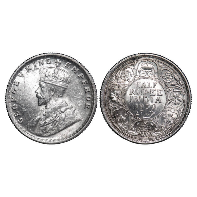 George V, Silver, Half Rupee, 1930, Calcutta Mint, No dot, Die crack on Rev. F. Prid 332. GK 1072. Almost Uncirculated. Very Scarce.