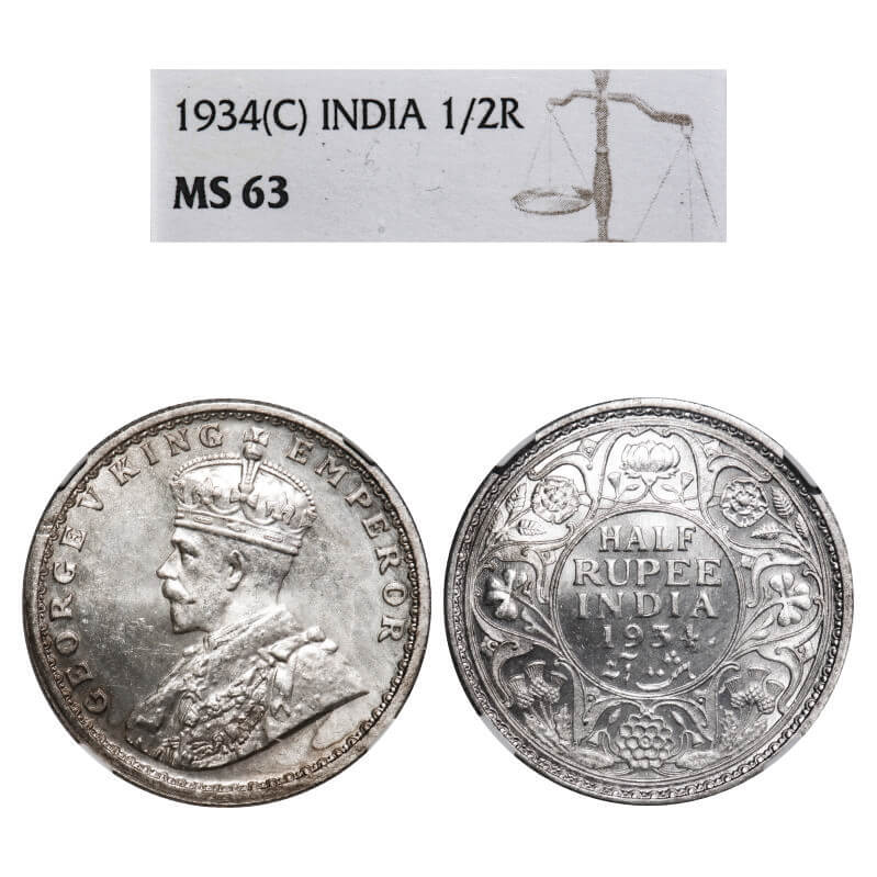 George V, Silver, Half Rupee, 1934, Calcutta Mint, No dot. F. Prid 334. GK 1074. NGC Slabbed MS 63. Very Rare.