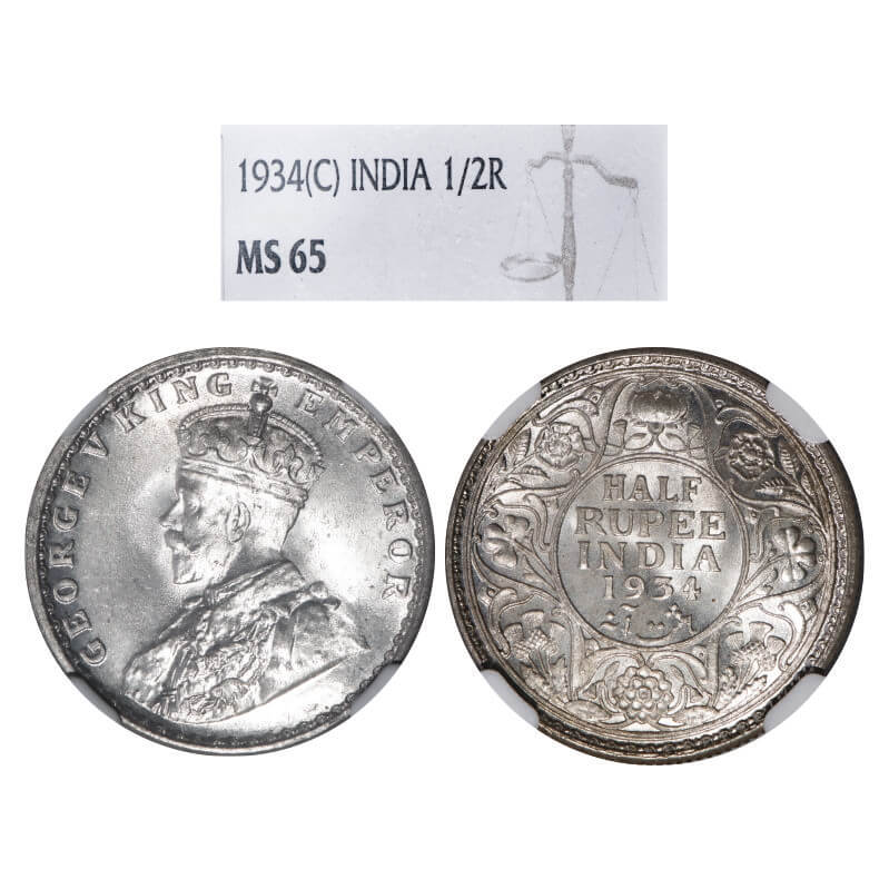 George V, Silver, Half Rupee, 1934, Calcutta Mint, No dot. F. Prid 334. GK 1074. NGC Slabbed MS 65. Extremely Rare.