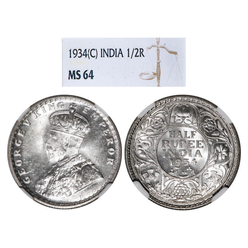 George V, Silver, Half Rupee, 1934, Calcutta Mint, No dot. F. Prid 334. GK 1074. NGC Slabbed MS 64. Very Rare.
