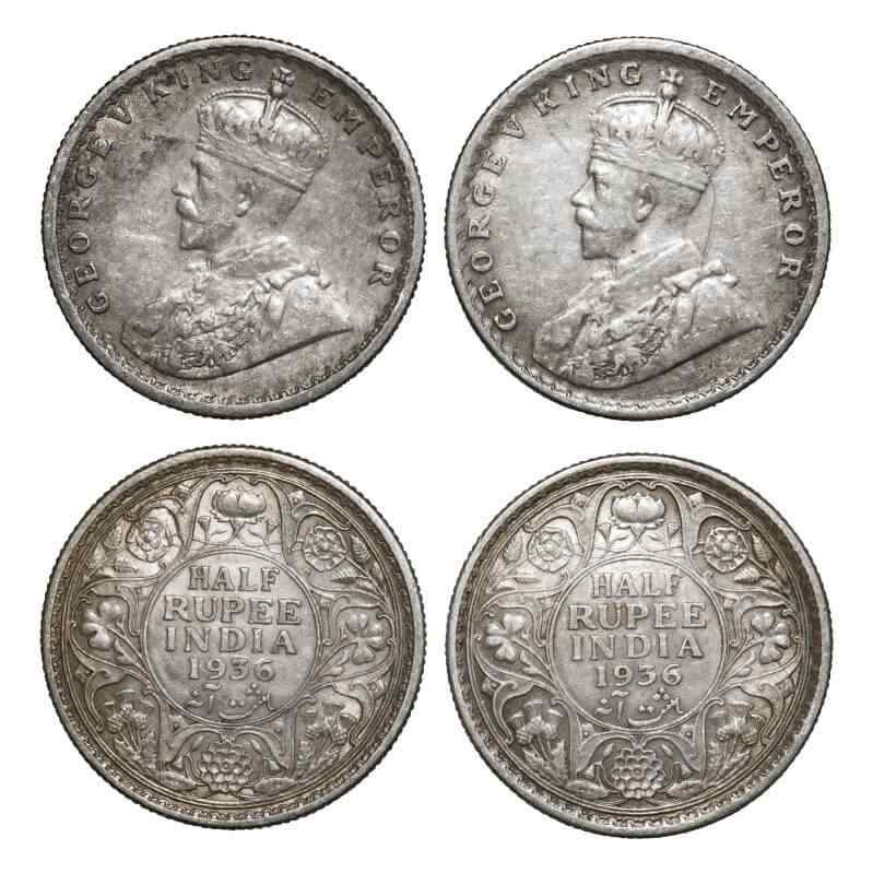 George V, Silver, Half Rupee, 1936 (2 coins), Calcutta Mint, No dot. F. Prid 335. GK 1075. Very Fine+ to Extremely Fine. Scarce.