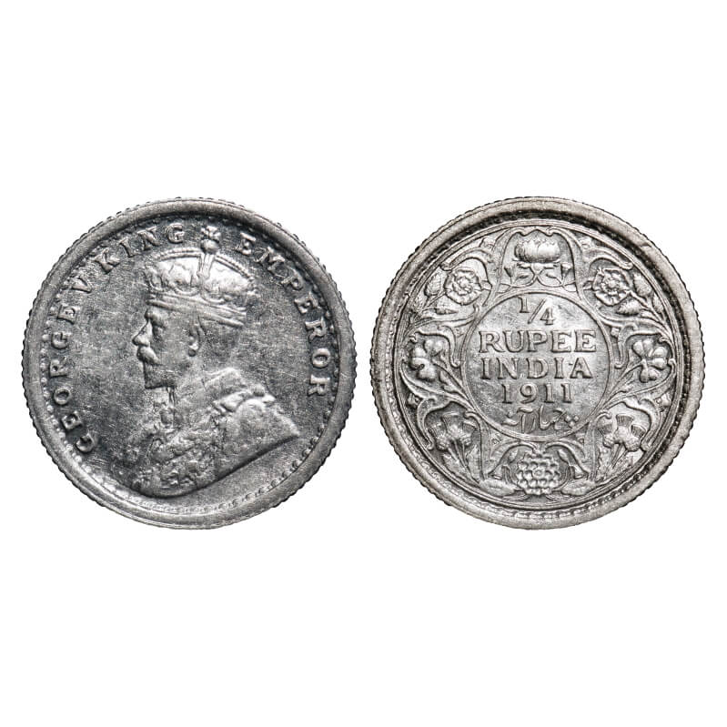 George V, Silver, 1/4 Rupee, 1911, Calcutta mint, No dot, Pig-Type. F. Prid 110. GK 1080. Extremely Fine+. Very Rare.