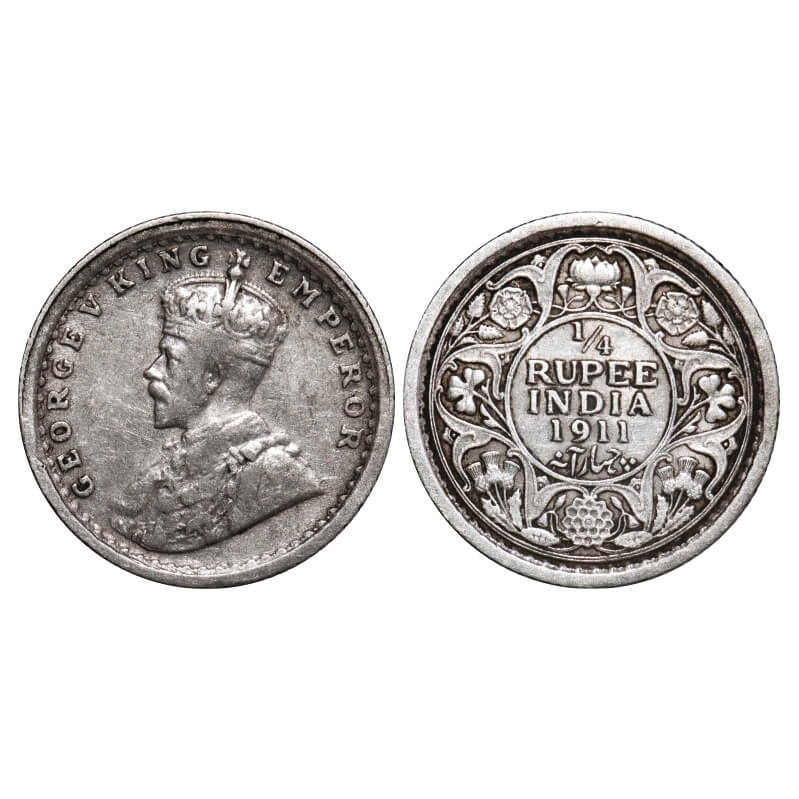 George V, Silver, 1/4 Rupee, 1911, Calcutta mint, No dot, Pig-Type. F. Prid 110. GK 1080. Extremely...