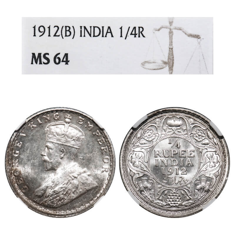George V, Silver, 1/4 Rupee, 1912, Bombay Mint, Dot, Re-Drawn Elephant. F. Prid 454. GK 1082. NGC Slabbed MS 64. Extremely Rare.