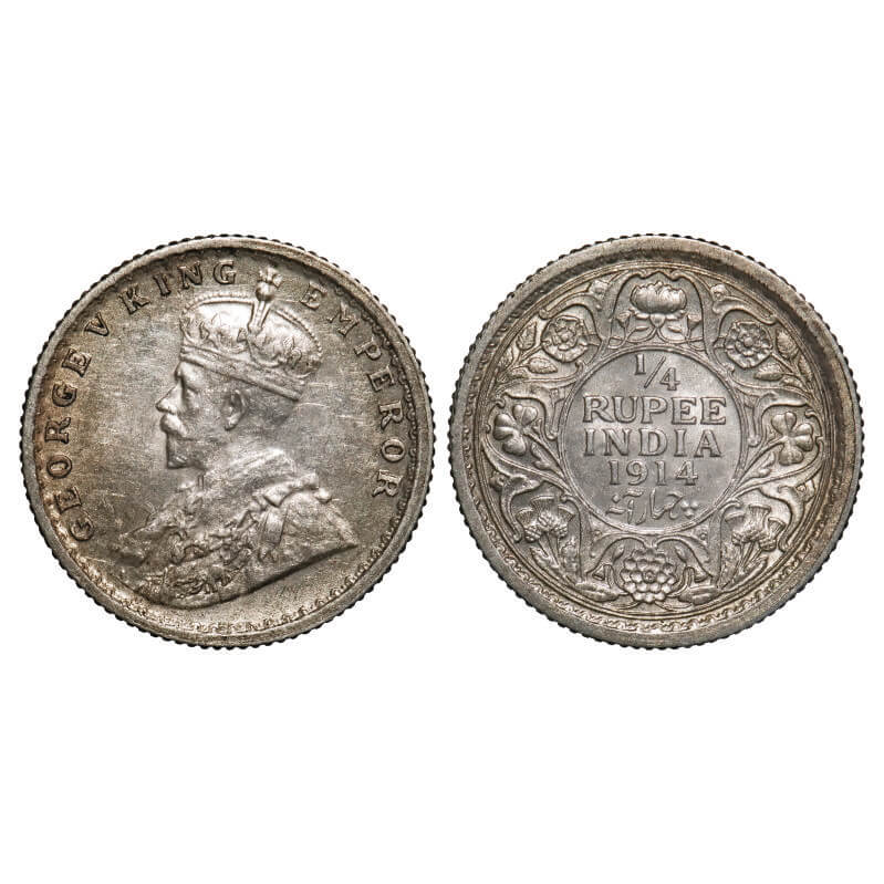 George V, Silver, 1/4 Rupee, 1914, Calcutta Mint, No dot. F. Prid 443. GK 1085. Extremely Fine+. Very Scarce.