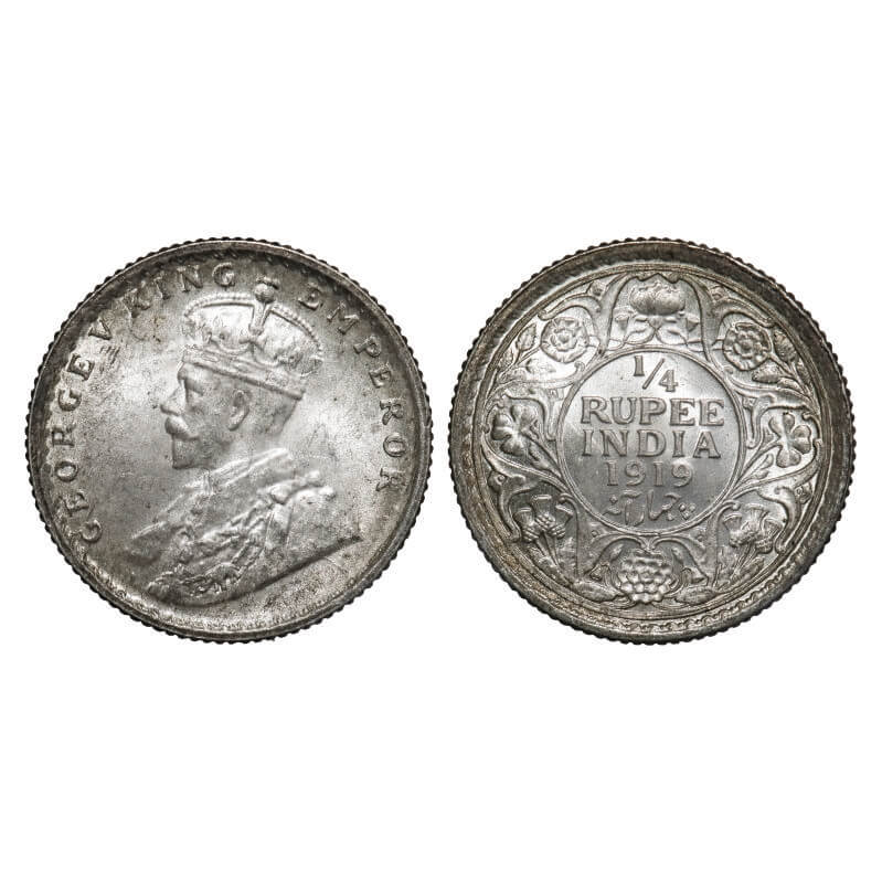 George V, Silver, 1/4 Rupee, 1919, Calcutta Mint, No dot, Ghost on Rev. F. Prid 448. GK 1092. Uncirculated. Very Scarce.