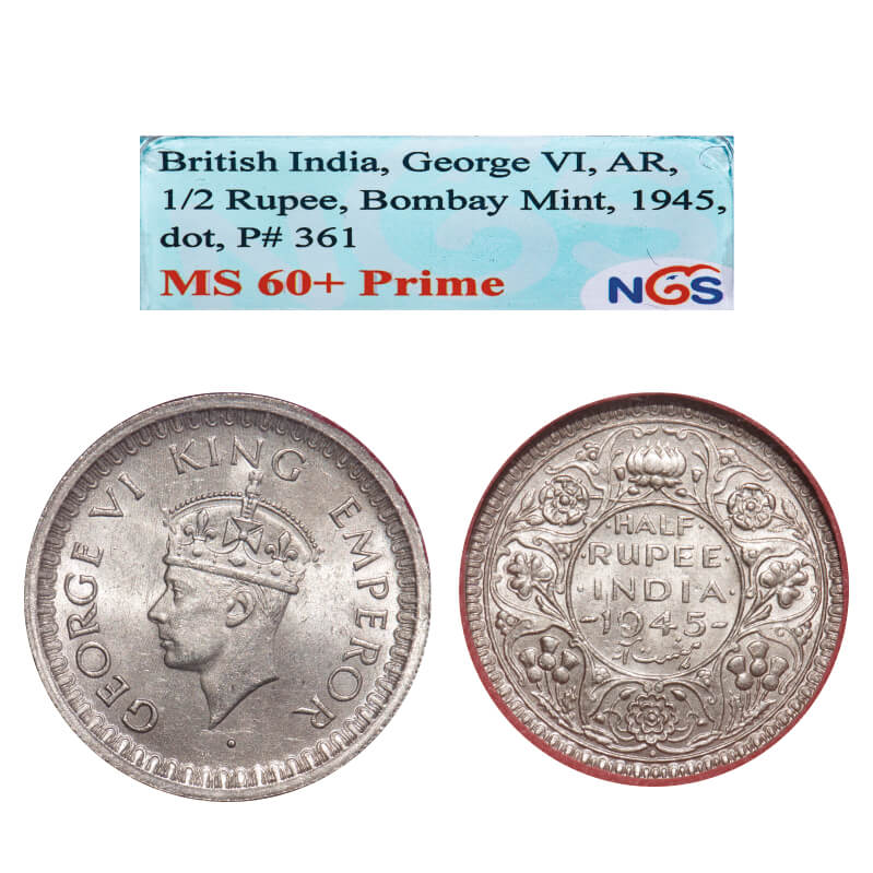 | George VI, Half Silver, Half Rupee, 1945, Bombay Mint, B/II, Head Type II, Dot, Security edge, Normal 5. F. Prid 361. GK 1316. NGS Slabbed MS 60+ Prime. Very Scarce. |