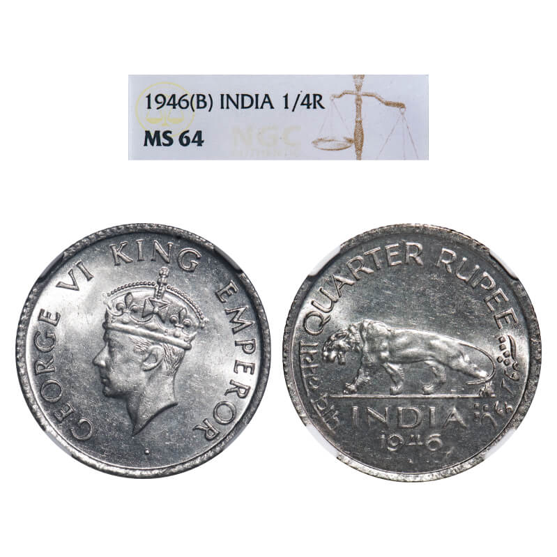 | George VI, Nickel, 1/4 Rupee, 1946, Bombay Mint, Diamond, Head Type II, Rev IV, Milled edge. F. Prid 868. GK 1346. NGC Slabbed MS 64. Very Rare. |