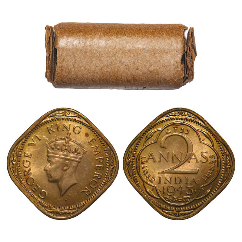 | George VI, Nickel-Brass, 2 Anna, (Roll of 20 coins), 1943, Bombay Mint, Dots by year, Head Type II, Large and thin numeral 3. 20 Coins in Immaculate Grades in a Brown paper Roll. F. Prid. GK 1361. Extremely Rare. |