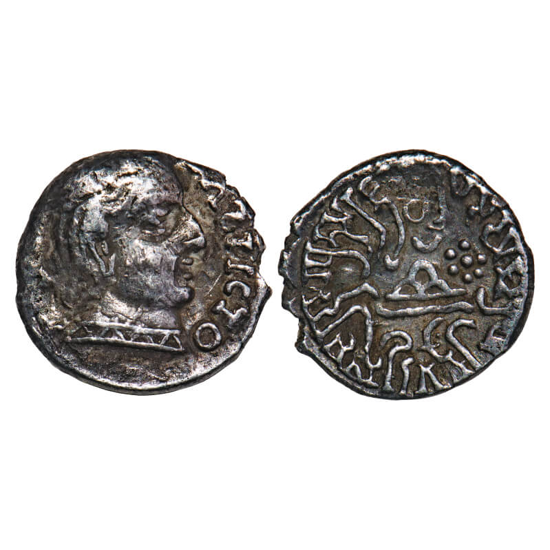 | Western Kshatrapas, Damjadasri II s/o Rudrasena (c. 232-234 AD), Silver Drachma, 1.97g, 14.42x15.10mm, Obv: Bust of king to right and around Greek corrupt legend, Rev: Three arched hill above crescent, left to moon and right sun symbol around Brahmi legend ‘Rajno Mahakshatrapasa Rudrasenaputrasa Rajno Kshatrapasa Damajadasriya’. Pieper # 3393. Very Fine, Very Scarce. |